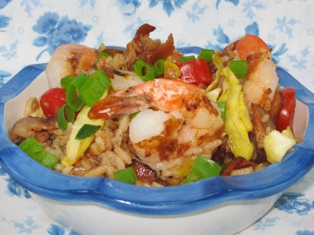 Put 2 tablespoons of the reserved bacon fat in a wok or large frying pan, add 1/2 cup chopped sweet onion and saute until tender; add 3 cups of COLD cooked rice, the crumbled bacon, 1/4 cup sliced green onion, 1/2 teaspoon salt, 1/4 teaspoon black pepper and any other chopped (cooked) vegetables you want to include; gently mix over medium heat.